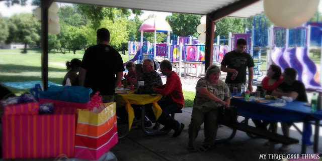 Decorations and activities included these adorable pom-pom balloons (I couldn't believe they worked!), and stations with crayons and colored pencils where guests could sprinkle some paper with color. The kids played at the park of course, as well as with bubbles and chalk.